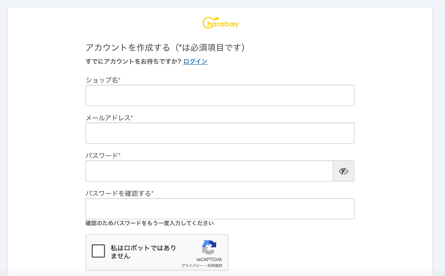 ショップ名・メールアドレス・パスワードとパスワード確認を入力し、その後登録メールに届いたメールから登録を完了してください。